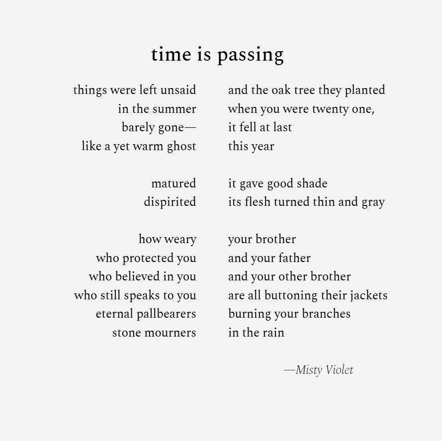 Time is Passing things were left unsaid and the oak tree they planted in the summer when you were twenty one, barely gone— it fell at last like a yet warm ghost this year matured it gave good shade dispirited its flesh turned thin and gray how weary your brother who protected you and your father who believed in you and your other brother who still speaks to you are all buttoning their jackets eternal pallbearers burning your branches stone mourners in the rain